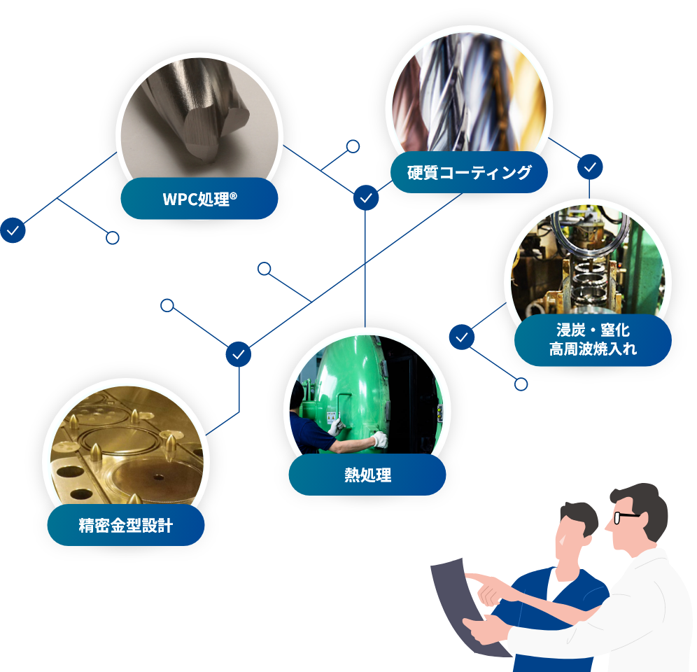 難しい表面処理の問題にも、従来の方法では解決できなかった課題にも、綿密な分析・調査と、複合処理を用いてしっかり対応します。「どうやって解決すればいいかわからない」という方は、まずは”金属のお悩み”を聞かせてください。専門知識がなくても大丈夫。私たちが的確な治療方法(解決策)を提案いたします。