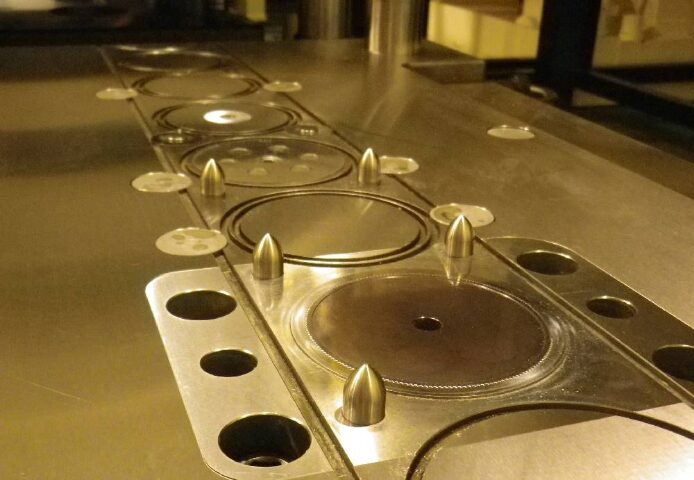 ・複数工程同時成形を可能にした高寿命ラミネートパック成形金型など、社内保有の3~5tonサーボプレス装置を使用して、型検証、テスト打ち抜きが可能